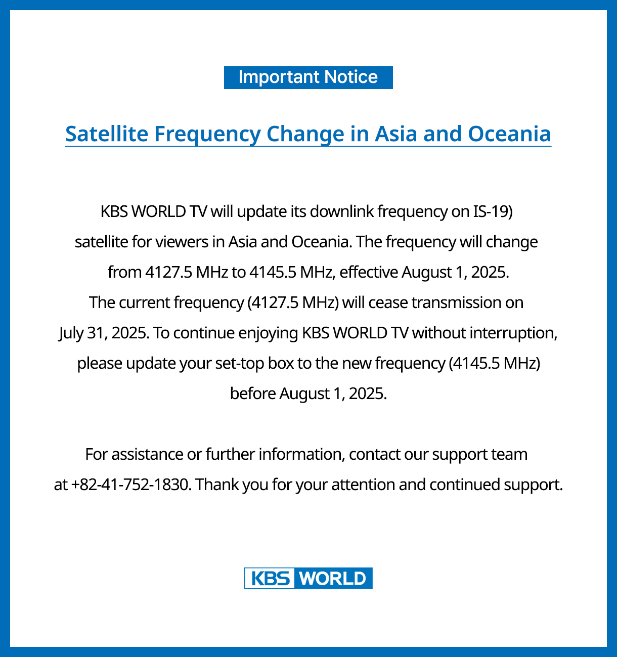 KBS World TV Satellite Frequency Change in Asia and Oceania